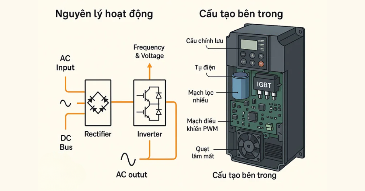 Để đảm bảo thang máy vận hành êm ái và dừng tầng chính xác, cấu tạo bên trong của biến tần được thiết kế vô cùng tinh vi với sự phối hợp nhịp nhàng giữa các khối linh kiện điện tử. Mỗi bộ phận đảm nhận một vai trò riêng biệt trong quy trình biến đổi năng lượng, giúp kiểm soát tốc độ động cơ một cách linh hoạt nhất.