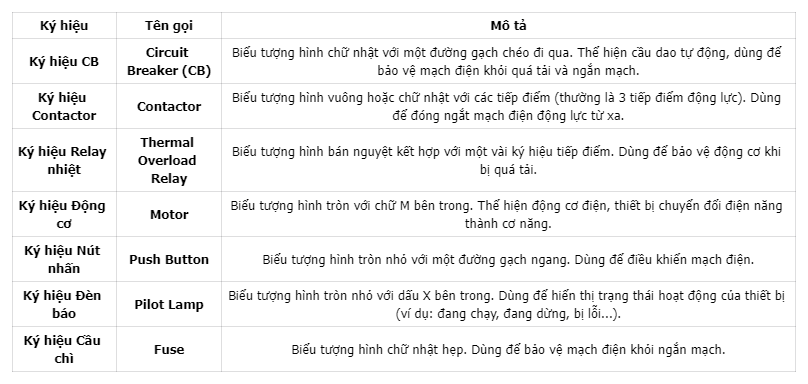 Lưu ý: Các ký hiệu có thể có sự khác biệt nhỏ tùy theo tiêu chuẩn (IEC, ANSI...). Khi sử dụng, bạn nên đối chiếu với phần chú thích ký hiệu trong bản vẽ.