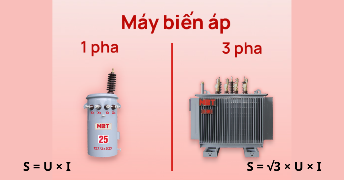 Máy biến áp 3 pha: Công thức là: S = √3 × U × I. Đây là công thức chuẩn được sử dụng phổ biến trong thiết kế và tính toán tải điện ba pha.