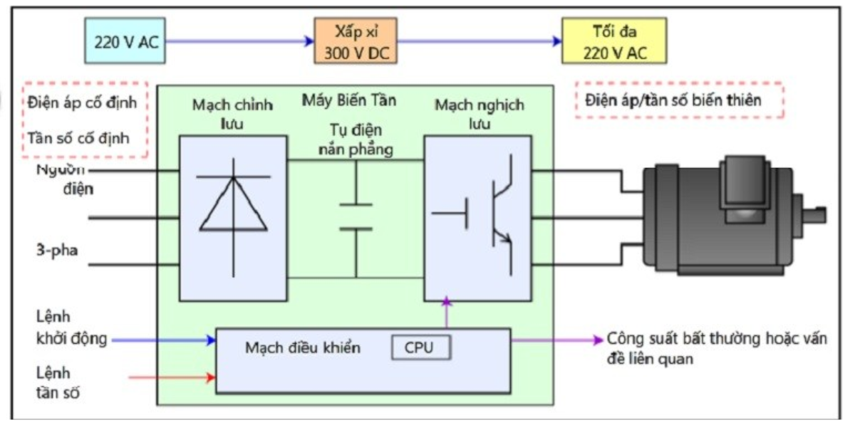 Dưới đây là cấu tạo bên trong của mạch biến tần được tóm tắt theo dạng các khối chức năng chính: