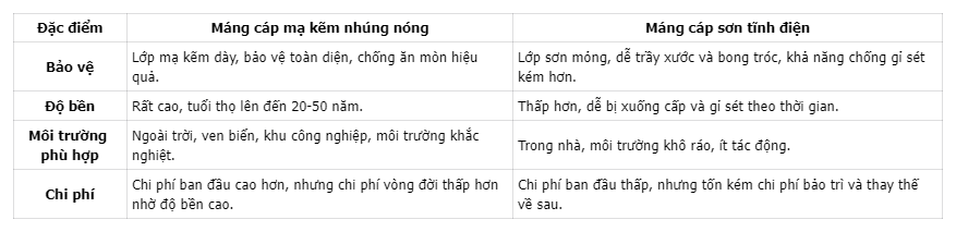Để đưa ra lựa chọn phù hợp nhất, bạn cần so sánh máng cáp mạ kẽm nhúng nóng với các loại máng cáp phổ biến khác trên thị trường, cụ thể là máng cáp sơn tĩnh điện và máng cáp mạ kẽm điện phân.