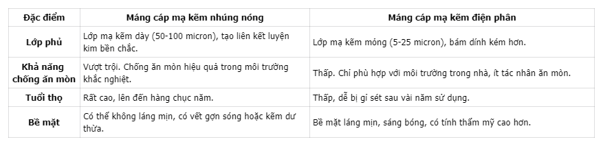 Độ dày lớp mạ: Lớp mạ kẽm nhúng nóng thường dày từ 50 đến 100 micron, dày hơn nhiều lần so với mạ điện phân, giúp tăng khả năng chống ăn mòn lên đáng kể.