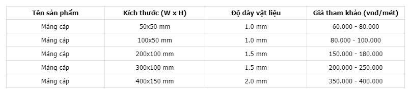 Để có cái nhìn tổng quan và lựa chọn máng cáp phù hợp, bạn cần nắm rõ các thông số kỹ thuật cơ bản. Dưới đây là các thông số chính và bảng giá tham khảo cho máng cáp mạ kẽm nhúng nóng.
