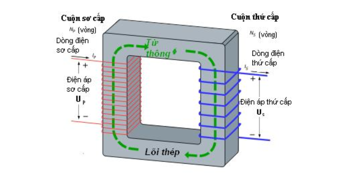 Cảm ứng điện áp: Từ trường này chạy xuyên qua cuộn dây thứ cấp ($N_2$). Sự biến thiên của từ thông qua cuộn dây thứ cấp sẽ sinh ra một suất điện động cảm ứng, tạo ra điện áp đầu ra ở mức mong muốn.